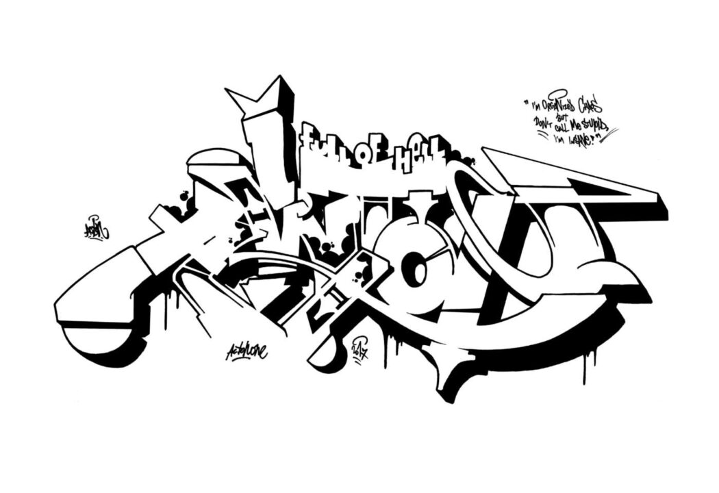 In more recent years I’ve continued the same habit, though nowadays the titles appear less on walls and more in my sketches and canvases. This particular Acton / Full of Hell piece was drawn in 2017, most likely during an artist residency in Marbella, Spain. I sketched a lot during that stay, though I never turned this one into an actual graffiti piece. A few years later, while studying fine arts, I reworked the letterforms into a mixed media piece.